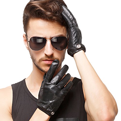 Nappaglo Men's Leather Gloves Lambskin Touchscreen Winter Warm Perforated Driving Motorcycle Mittens (L (Palm Girth:8.5"-9"), Black (Touchscreen))