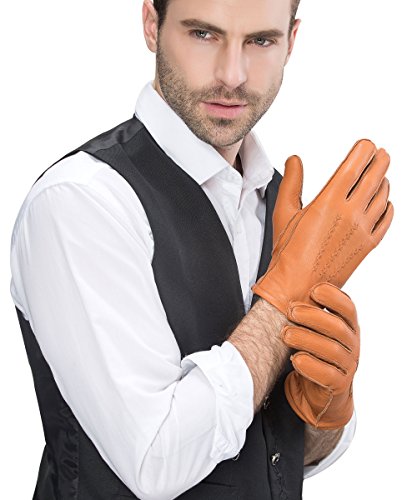 COOMEN Men's Deerskin Leather Warm Fur Fleece Lined Winter Dress Gloves Three Points-Cognac-9"/M