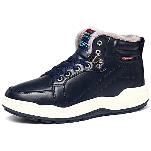 VILOCY Men's Warm Leather Waterproof Snow Boots Anti-slip Fur Lined Ankle Sneakers High Top Shoes Dark Blue,44