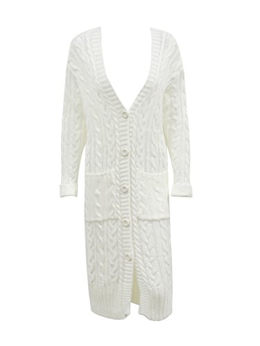 Missy Chilli Women's Cable Knitted Button Long Cardigan Sweater Coat with Pocket White