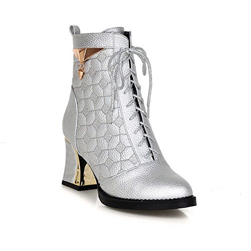 AmoonyFashion Women's Round-Toe Closed-Toe High-Heels Boots with Thick Heels, Silver, 39