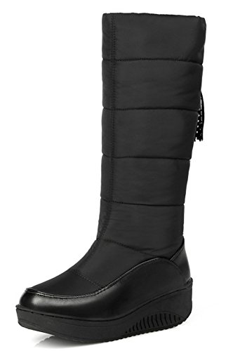 Sfnld Women's Trendy Round Toe Platform Tassels Low Wedge Heel Mid Calf Snow Boots Black 5 B(M) US is one of the