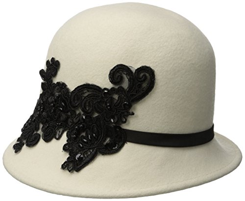 San Diego Hat Company Women's Wool Felt Cloche Hat with Sequin Lace Aplique Trim, Ivory, One Size