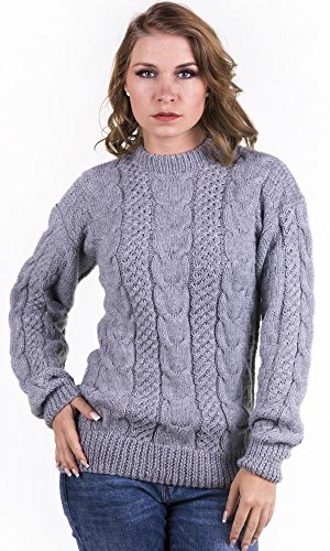 - DESIGN: Round neck sweater with Irish Aran style handknit pattern. This beautiful sweater is warm and comfortable, perfect for the cold season of the year.
